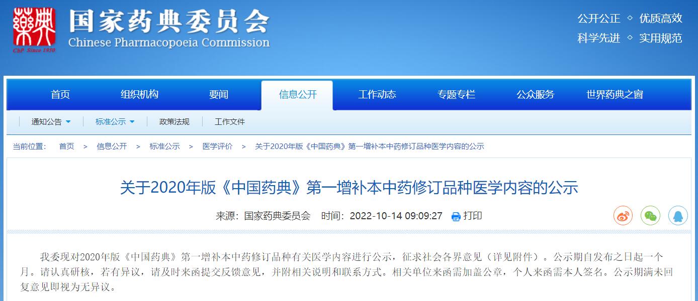 關(guān)于2020年版《中國藥典》第一增補(bǔ)本中藥修訂品種醫(yī)學(xué)內(nèi)容的公示