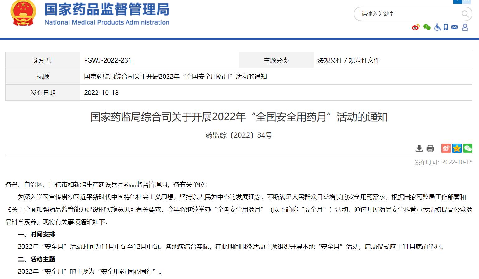 國家藥監(jiān)局綜合司關(guān)于開展2022年“全國安全用藥月”活動(dòng)的通知