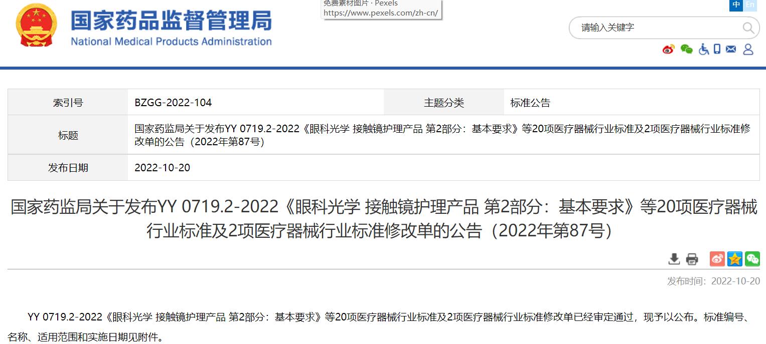 國家藥監(jiān)局關(guān)于發(fā)布YY 0719.2-2022《眼科光學(xué)接觸鏡護(hù)理產(chǎn)品第2部分:基本要求》等20項(xiàng)醫(yī)療器械行業(yè)標(biāo)準(zhǔn)及2項(xiàng)醫(yī)療器械行業(yè)標(biāo)準(zhǔn)修改單的公告(2022年第87號)