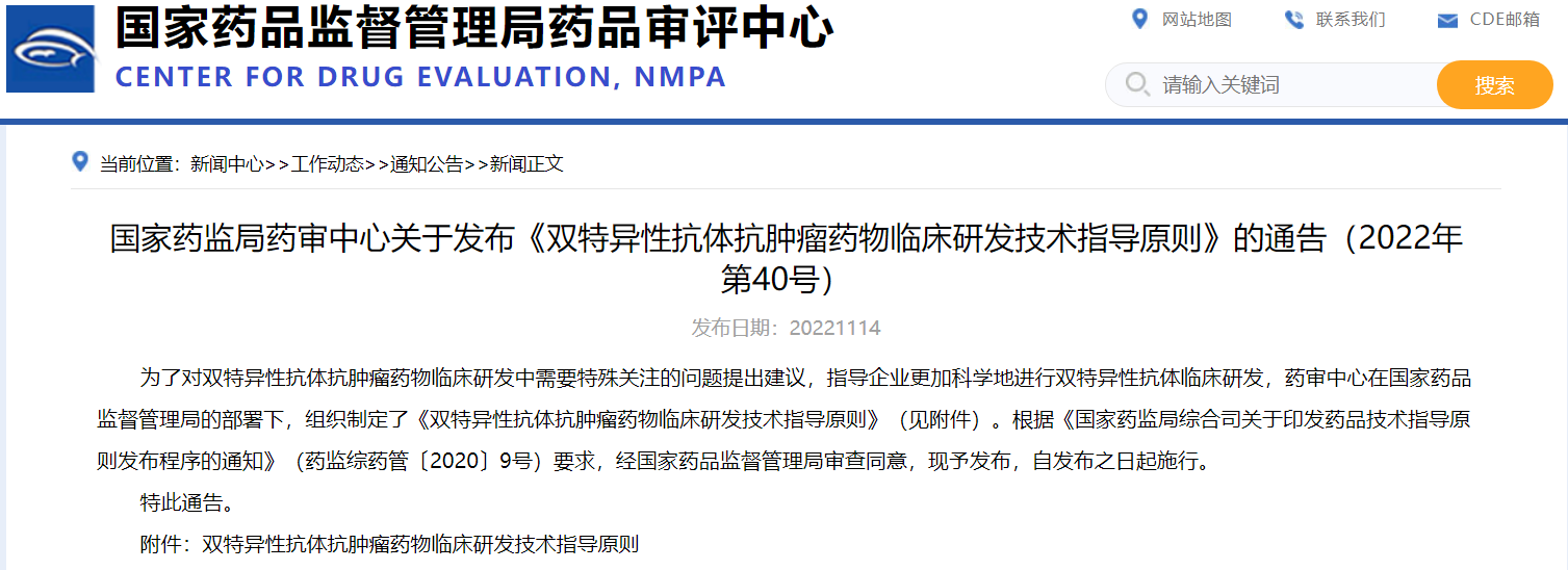 國家藥監(jiān)局藥審中心關(guān)于發(fā)布《雙特異性抗體抗腫瘤藥物臨床研發(fā)技術(shù)指導(dǎo)原則》的通告(2022年第40號(hào))