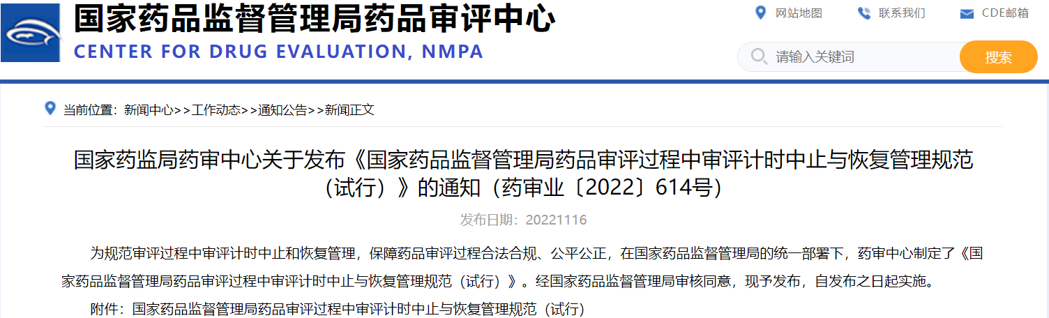 國家藥監(jiān)局藥審中心關(guān)于發(fā)布《國家藥品監(jiān)督管理局藥品審評(píng)過程中審評(píng)計(jì)時(shí)中止與恢復(fù)管理規(guī)范(試行)》的通知(藥審業(yè)〔2022〕614號(hào))