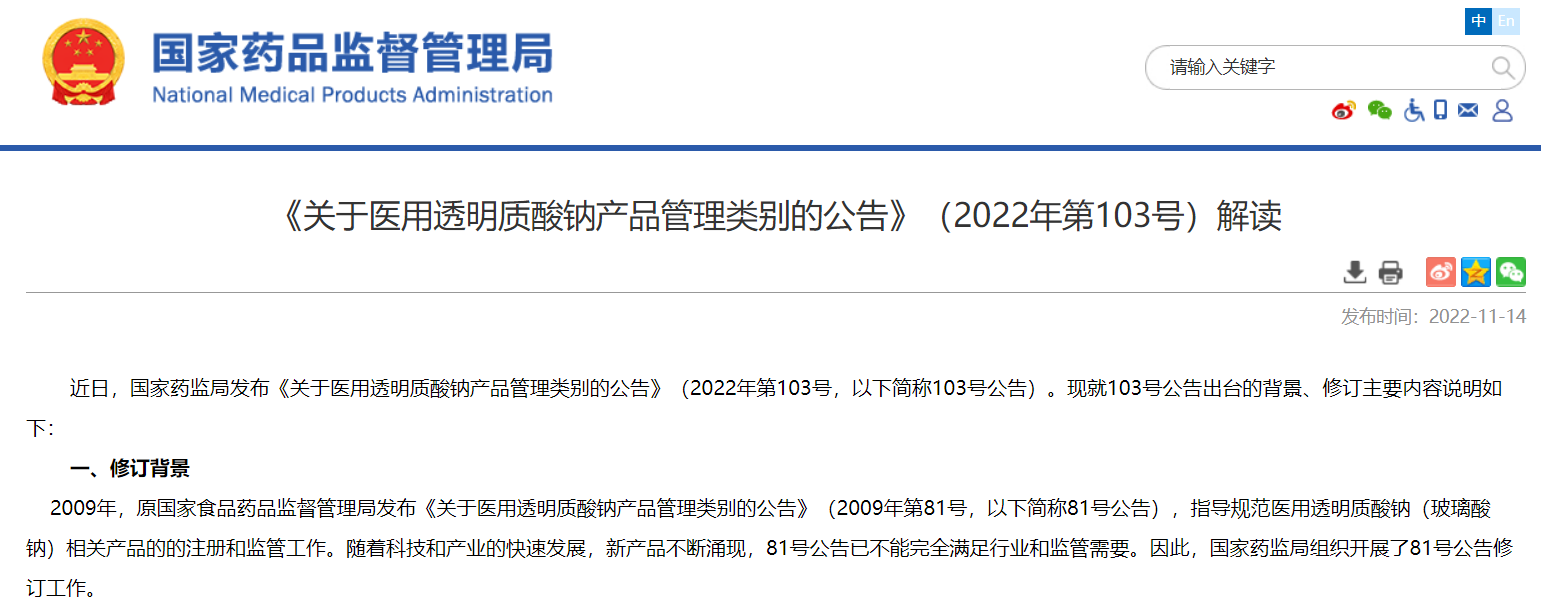 國家藥監(jiān)局關(guān)于醫(yī)用透明質(zhì)酸鈉產(chǎn)品管理類別的公告(2022年第103號(hào))