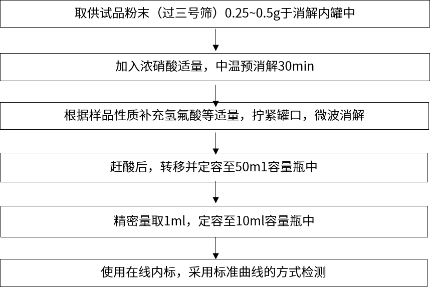 案例二:新領(lǐng)先醫(yī)藥分析測試中心使用電感耦合等離子體質(zhì)譜儀(ICP-MS)進(jìn)行了中藥材中的鉛、鎘、砷、汞、銅等元素的的檢測。ICP-MS元素檢測的前處理方法流程如下: