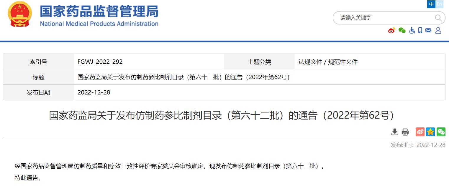 國(guó)家藥監(jiān)局關(guān)于發(fā)布仿制藥參比制劑目錄(第六十二批)的通告(2022年第62號(hào))