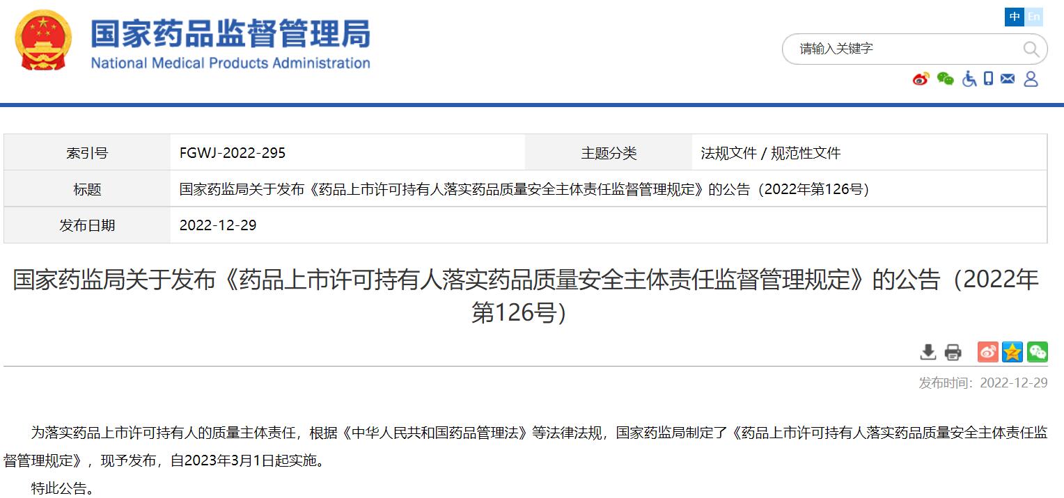 國(guó)家藥監(jiān)局關(guān)于發(fā)布《藥品上市許可持有人落實(shí)藥品質(zhì)量安全主體責(zé)任監(jiān)督管理規(guī)定》的公告(2022年第126號(hào))