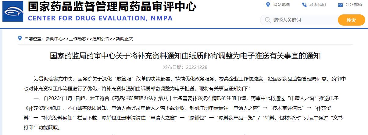 國(guó)家藥監(jiān)局藥審中心關(guān)于將補(bǔ)充資料通知由紙質(zhì)郵寄調(diào)整為電子推送有關(guān)事宜的通知