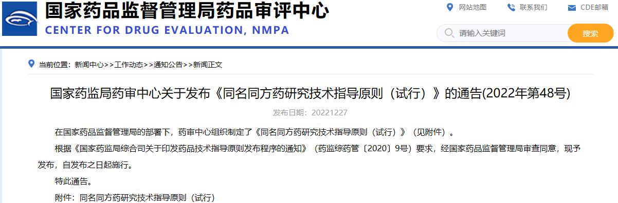 國(guó)家藥監(jiān)局藥審中心關(guān)于發(fā)布《同名同方藥研究技術(shù)指導(dǎo)原則(試行)》的通告(2022年第48號(hào))