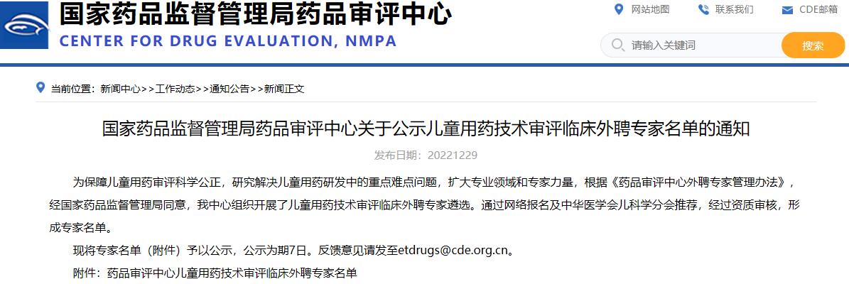 國(guó)家藥品監(jiān)督管理局藥品審評(píng)中心關(guān)于公示兒童用藥技術(shù)審評(píng)臨床外聘專家名單的通知