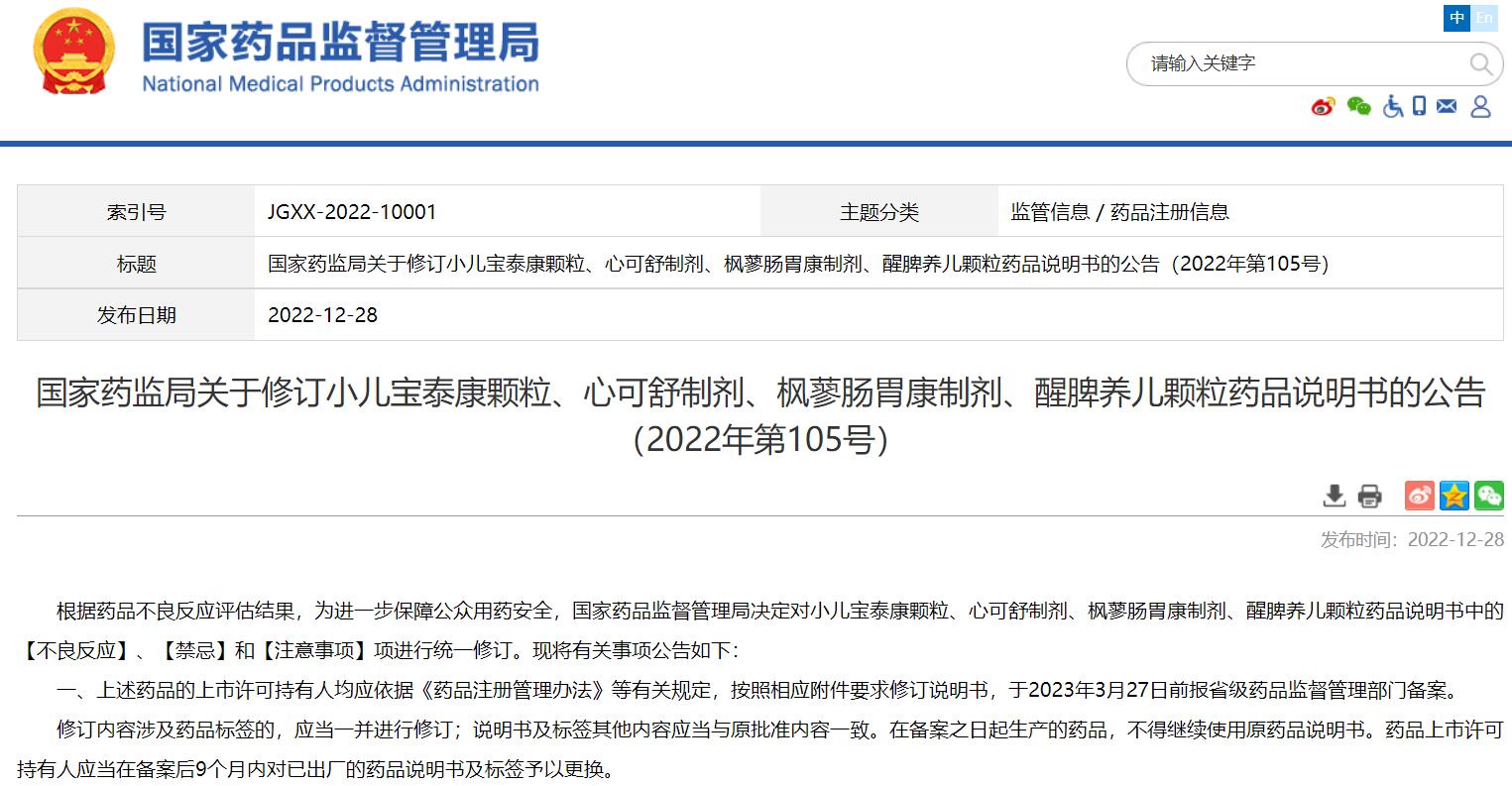 國(guó)家藥監(jiān)局關(guān)于修訂小兒寶泰康顆粒、心可舒制劑、楓蓼腸胃康制劑、醒脾養(yǎng)兒顆粒藥品說(shuō)明書(shū)的公告(2022年第105號(hào))