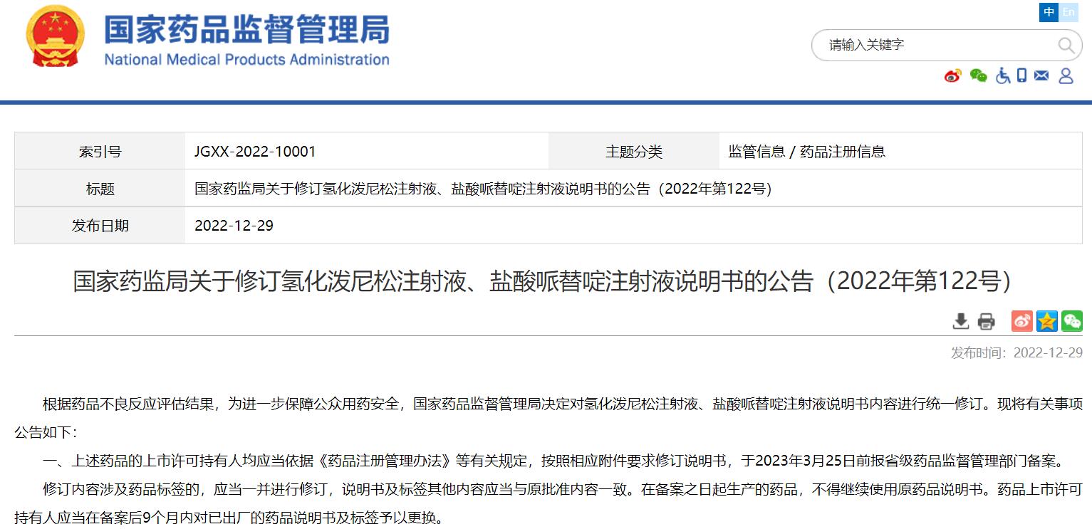 國(guó)家藥監(jiān)局關(guān)于修訂氫化潑尼松注射液、鹽酸哌替啶注射液說(shuō)明書(shū)的公告(2022年第122號(hào))