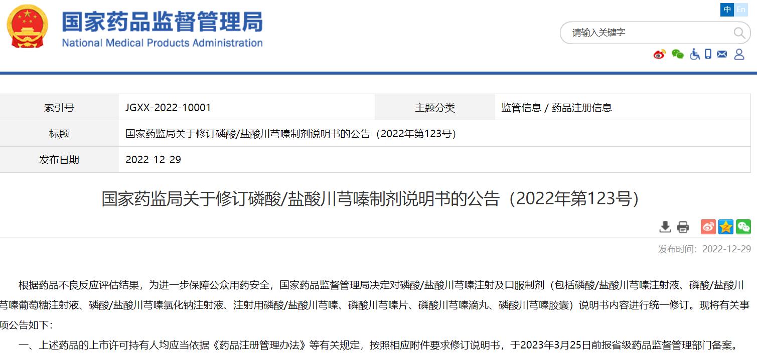 國(guó)家藥監(jiān)局關(guān)于修訂磷酸/鹽酸川芎嗪制劑說(shuō)明書(shū)的公告(2022年第123號(hào))