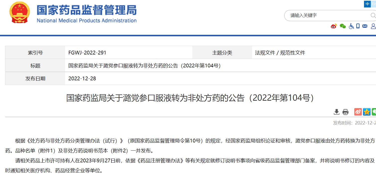 國(guó)家藥監(jiān)局關(guān)于潞黨參口服液轉(zhuǎn)為非處方藥的公告(2022年第104號(hào))