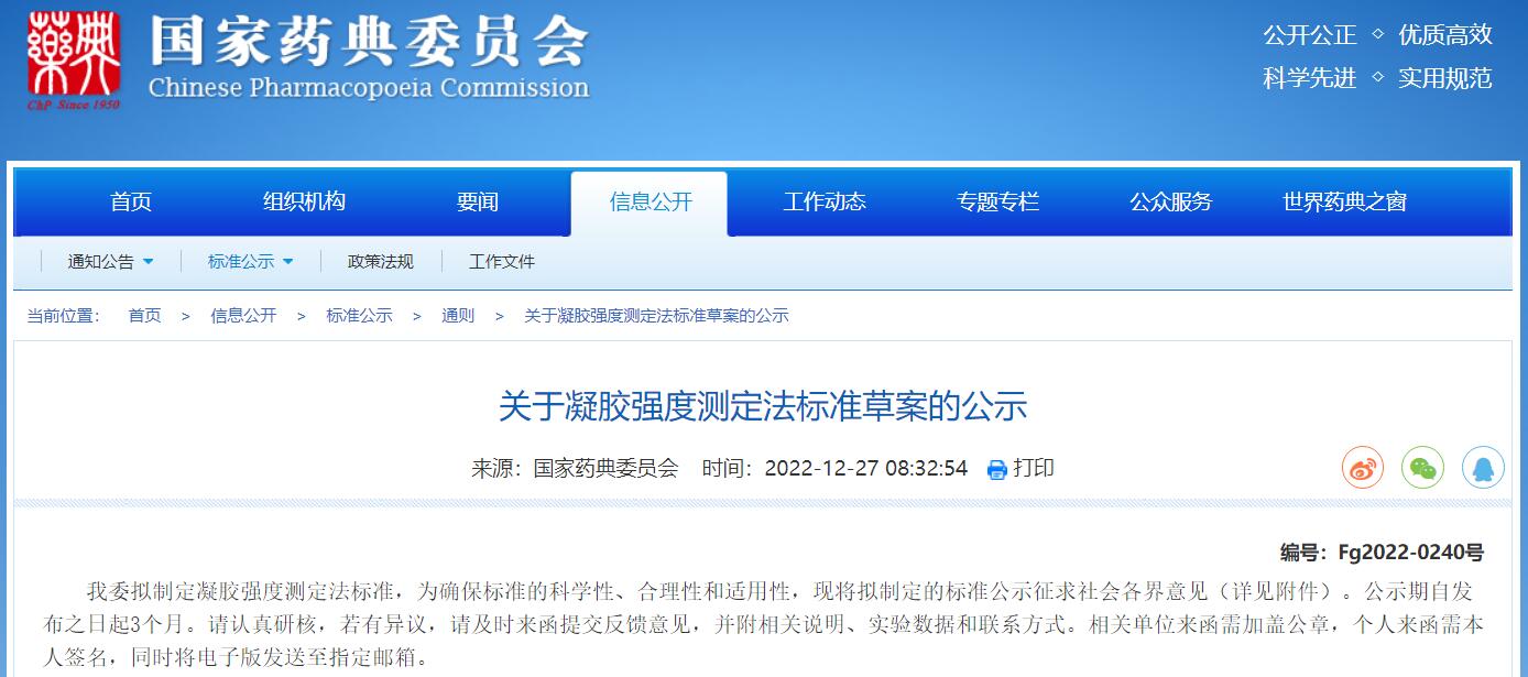 國(guó)家藥典委發(fā)布凝膠強(qiáng)度測(cè)定法標(biāo)準(zhǔn)草案的公示。