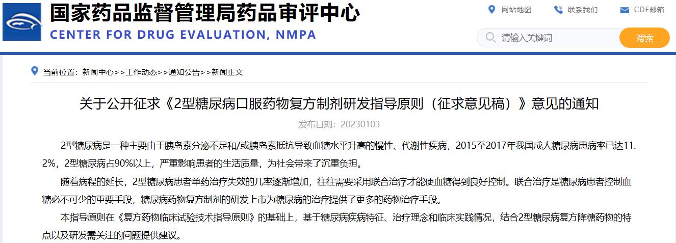關(guān)于公開(kāi)征求《2型糖尿病口服藥物復(fù)方制劑研發(fā)指導(dǎo)原則(征求意見(jiàn)稿)》意見(jiàn)的通知