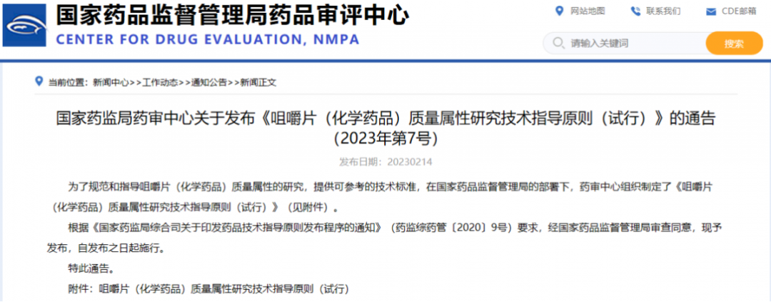 國家藥監(jiān)局藥審中心關(guān)于發(fā)布《咀嚼片(化學(xué)藥品)質(zhì)量屬性研究技術(shù)指導(dǎo)原則(試行)》的通告(2023年第7號)