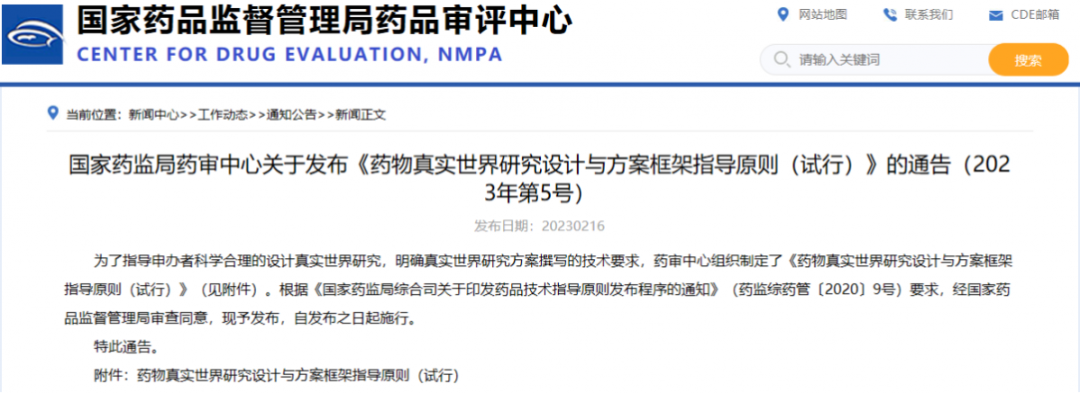 國家藥監(jiān)局藥審中心關(guān)于發(fā)布《藥物真實世界研究設(shè)計與方案框架指導(dǎo)原則(試行)》的通告(2023年第5號)