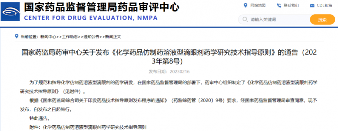 國家藥監(jiān)局藥審中心關(guān)于發(fā)布《化學(xué)藥品仿制藥溶液型滴眼劑藥學(xué)研究技術(shù)指導(dǎo)原則》的通告(2023年第8號)