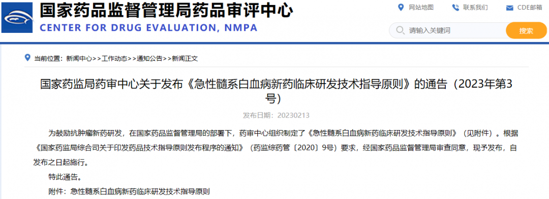 國家藥監(jiān)局藥審中心關(guān)于發(fā)布《急性髓系白血病新藥臨床研發(fā)技術(shù)指導(dǎo)原則》的通告(2023年第3號)