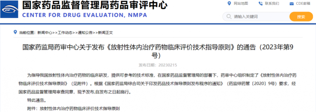 國家藥監(jiān)局藥審中心關(guān)于發(fā)布《放射性體內(nèi)治療藥物臨床評價技術(shù)指導(dǎo)原則》的通告(2023年第9號)