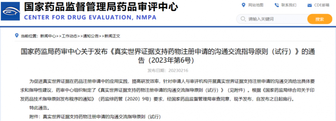 國家藥監(jiān)局藥審中心關(guān)于發(fā)布《真實世界證據(jù)支持藥物注冊申請的溝通交流指導(dǎo)原則(試行)》的通告(2023年第6號)