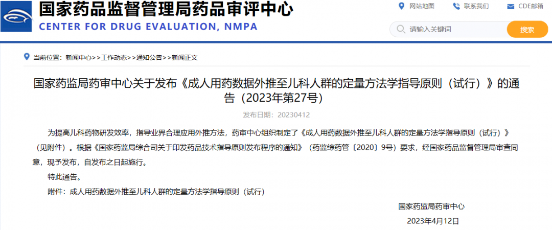 國家藥監(jiān)局藥審中心關(guān)于發(fā)布《成人用藥數(shù)據(jù)外推至兒科人群的定量方法學(xué)指導(dǎo)原則(試行)》的通告(2023年第27號(hào))