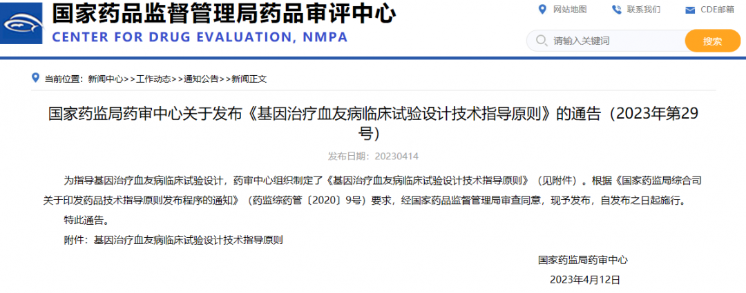 國家藥監(jiān)局藥審中心關(guān)于發(fā)布《基因治療血友病臨床試驗(yàn)設(shè)計(jì)技術(shù)指導(dǎo)原則》的通告(2023年第29號(hào))