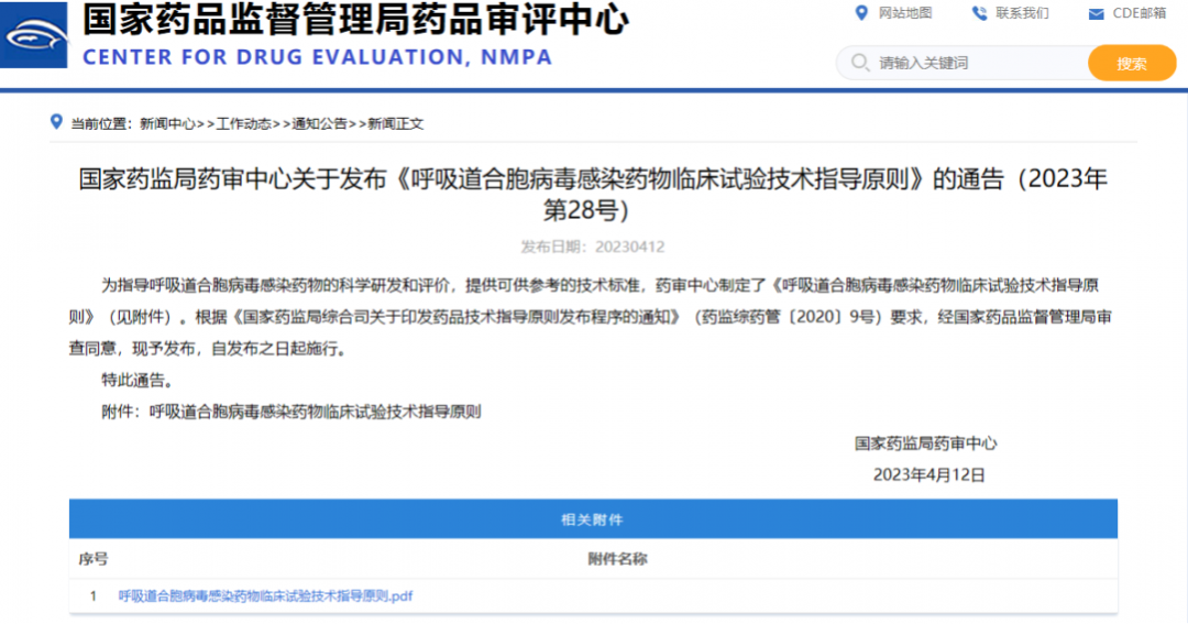 國家藥監(jiān)局藥審中心關(guān)于發(fā)布《呼吸道合胞病毒感染藥物臨床試驗(yàn)技術(shù)指導(dǎo)原則》的通告(2023年第28號(hào))