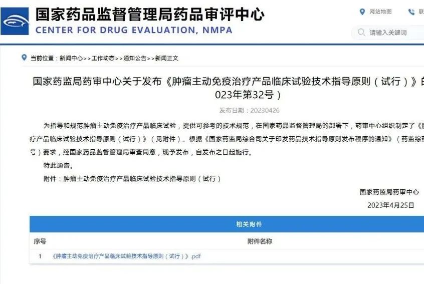 國家藥監(jiān)局藥審中心關(guān)于發(fā)布《腫瘤主動免疫治療產(chǎn)品臨床試驗(yàn)技術(shù)指導(dǎo)原則(試行)》的通告(2023年第32號)