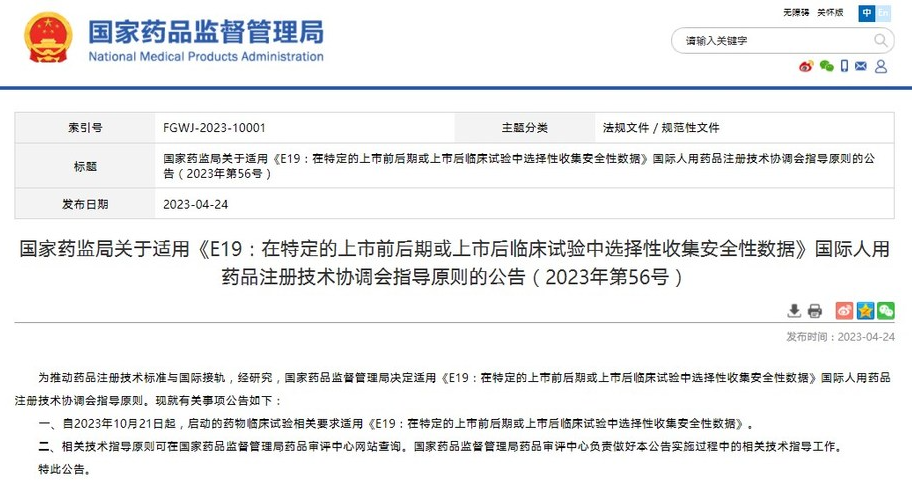 國家藥監(jiān)局關(guān)于適用《E19:在特定的上市前后期或上市后臨床試驗(yàn)中選擇性收集安全性數(shù)據(jù)》國際人用藥品注冊技術(shù)協(xié)調(diào)會指導(dǎo)原則的公告(2023年第56號)