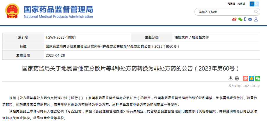 國家藥監(jiān)局關(guān)于地氯雷他定分散片等4種處方藥轉(zhuǎn)換為非處方藥的公告(2023年第60號)