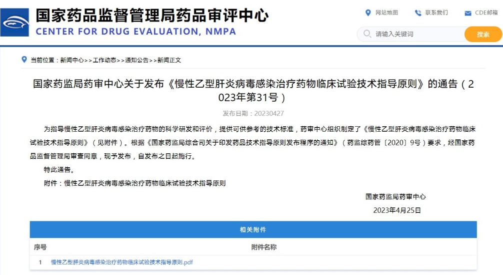 國家藥監(jiān)局藥審中心關(guān)于發(fā)布《慢性乙型肝炎病毒感染治療藥物臨床試驗(yàn)技術(shù)指導(dǎo)原則》的通告(2023年第31號)