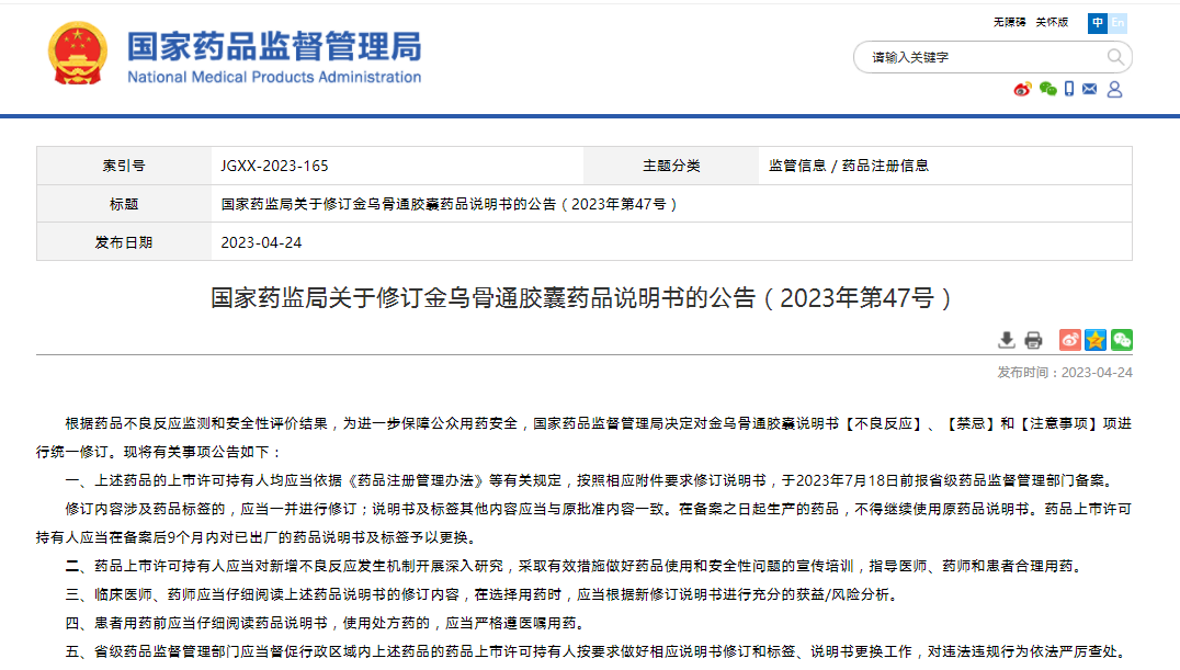 國家藥監(jiān)局關(guān)于修訂金烏骨通膠囊藥品說明書的公告(2023年第47號)