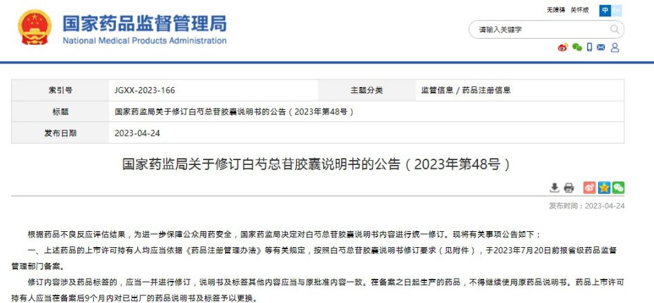 國家藥監(jiān)局關(guān)于修訂白芍總苷膠囊說明書的公告(2023年第48號)