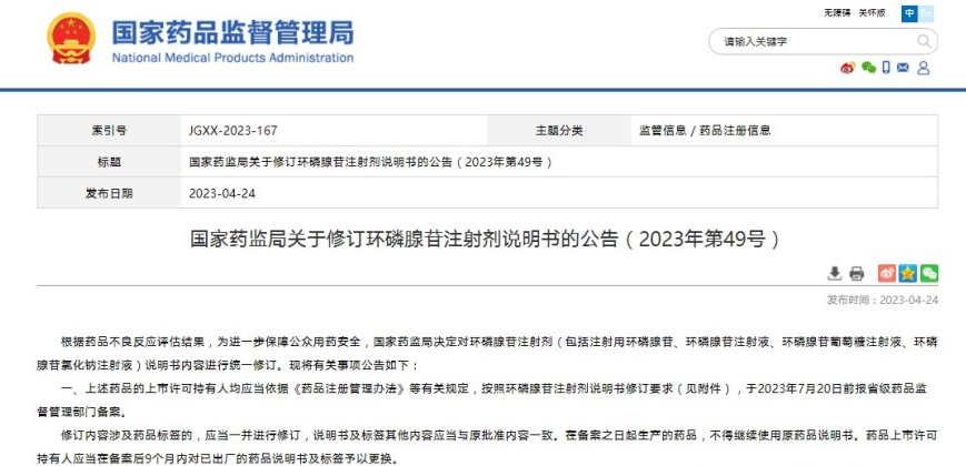 國家藥監(jiān)局關(guān)于修訂環(huán)磷腺苷注射劑說明書的公告(2023年第49號)
