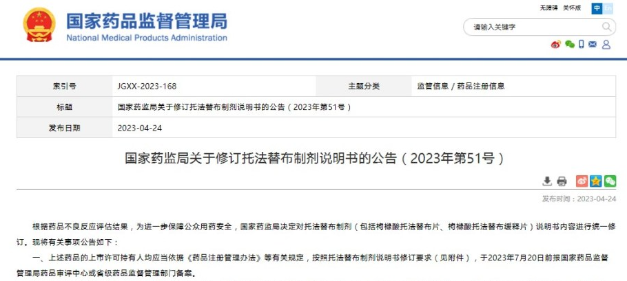 國家藥監(jiān)局關(guān)于修訂托法替布制劑說明書的公告(2023年第51號)