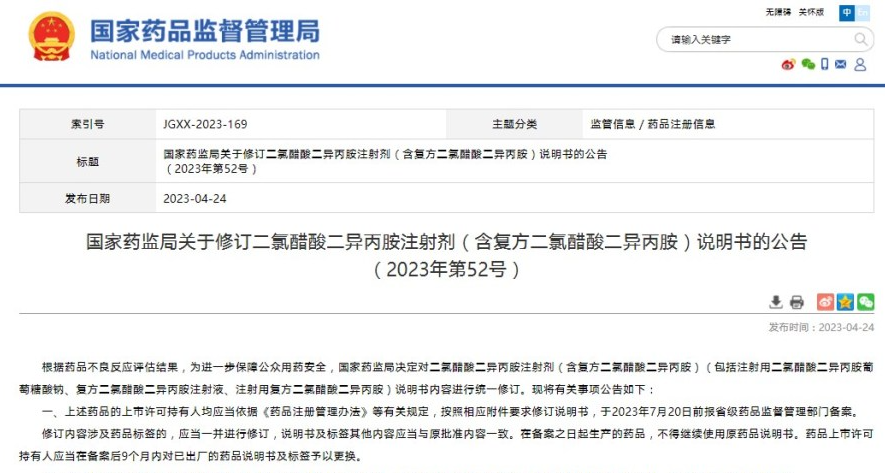 國家藥監(jiān)局關(guān)于修訂二氯醋酸二異丙胺注射劑(含復(fù)方二氯醋酸二異丙胺)說明書的公告(2023年第52號)