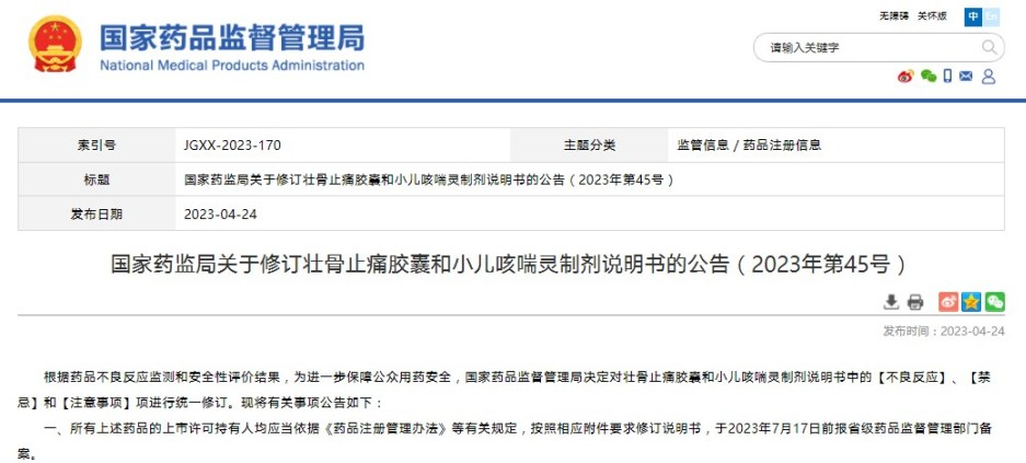 國家藥監(jiān)局關(guān)于修訂壯骨止痛膠囊和小兒咳喘靈制劑說明書的公告(2023年第45號)
