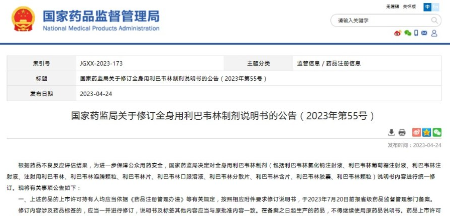 國家藥監(jiān)局關(guān)于修訂全身用利巴韋林制劑說明書的公告(2023年第55號)