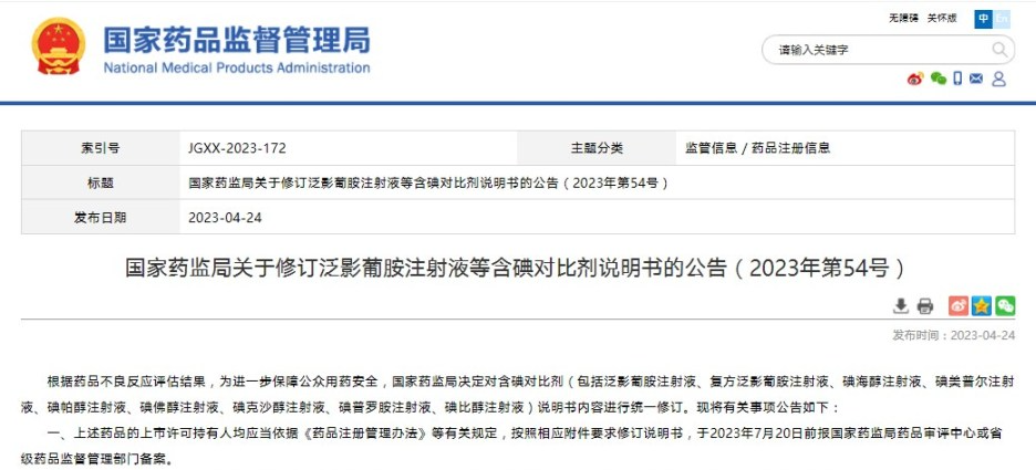 國家藥監(jiān)局關(guān)于修訂泛影葡胺注射液等含碘對比劑說明書的公告(2023年第54號)
