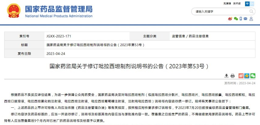國家藥監(jiān)局關(guān)于修訂吡拉西坦制劑說明書的公告(2023年第53號)
