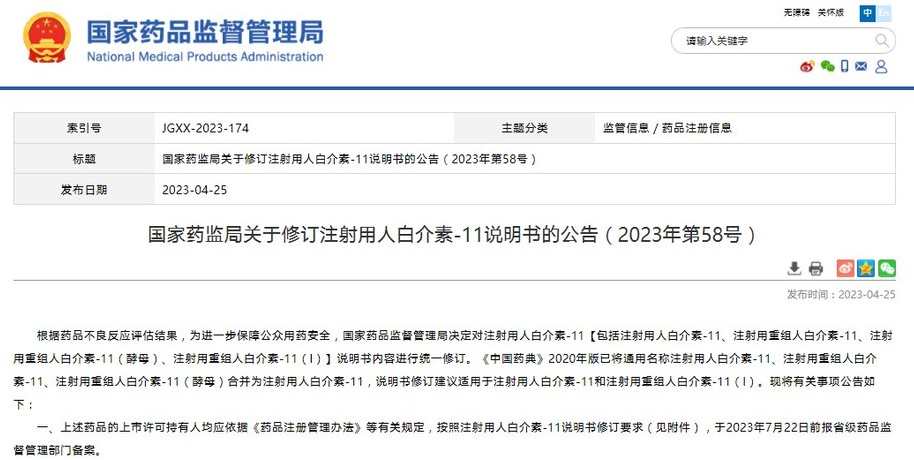國家藥監(jiān)局關(guān)于修訂注射用人白介素-11說明書的公告(2023年第58號)