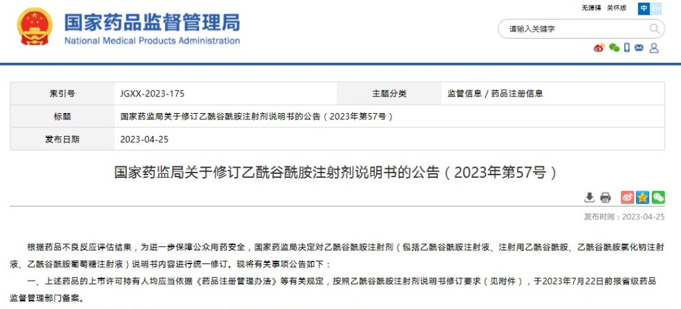 國家藥監(jiān)局關(guān)于修訂乙酰谷酰胺注射劑說明書的公告(2023年第57號)