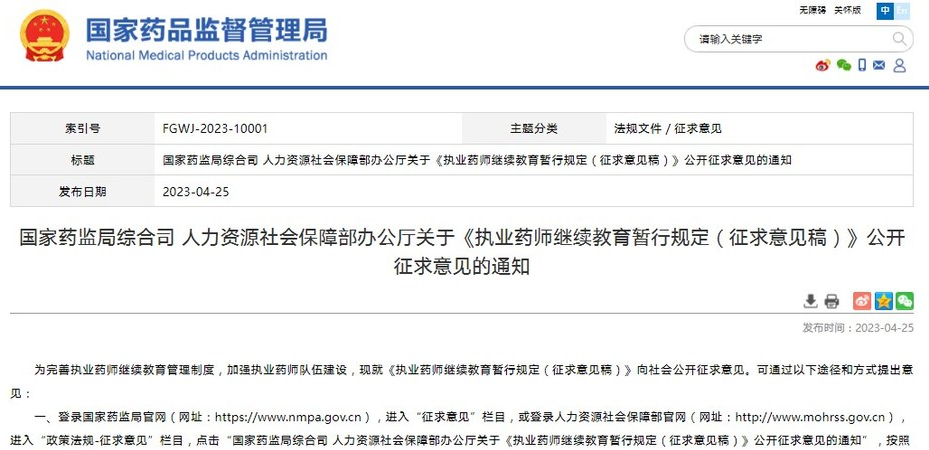 國家藥監(jiān)局綜合司 人力資源社會保障部辦公廳關(guān)于《執(zhí)業(yè)藥師繼續(xù)教育暫行規(guī)定(征求意見稿)》公開征求意見的通知
