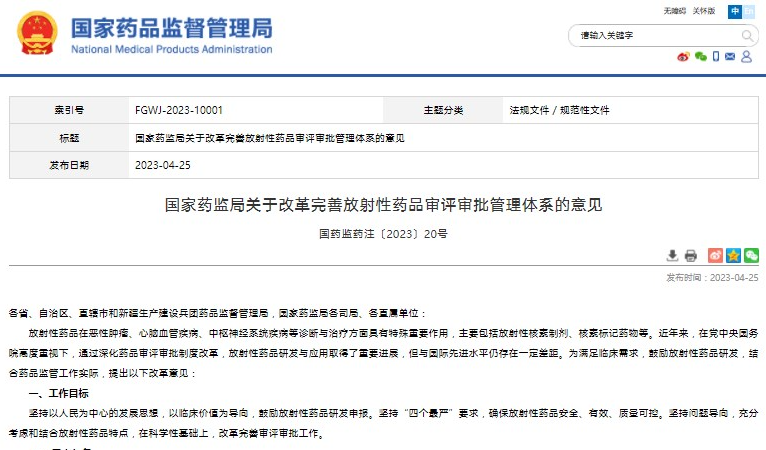 國家藥監(jiān)局關(guān)于改革完善放射性藥品審評審批管理體系的意見