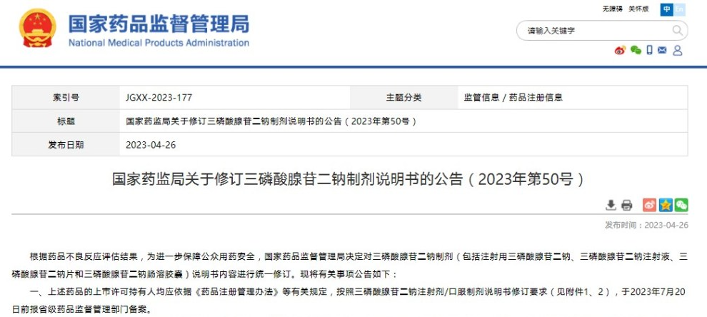 國家藥監(jiān)局關(guān)于修訂三磷酸腺苷二鈉制劑說明書的公告(2023年第50號)