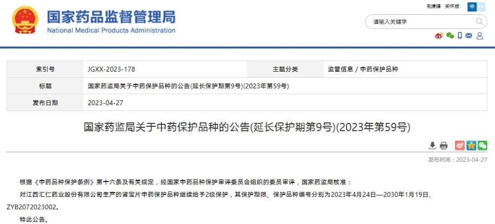 國家藥監(jiān)局關(guān)于中藥保護(hù)品種的公告(延長保護(hù)期第9號)(2023年第59號)