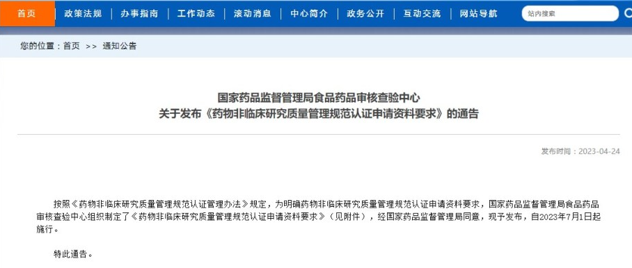 國家藥品監(jiān)督管理局食品藥品審核查驗(yàn)中心關(guān)于發(fā)布《藥物非臨床研究質(zhì)量管理規(guī)范認(rèn)證申請資料要求》的通告