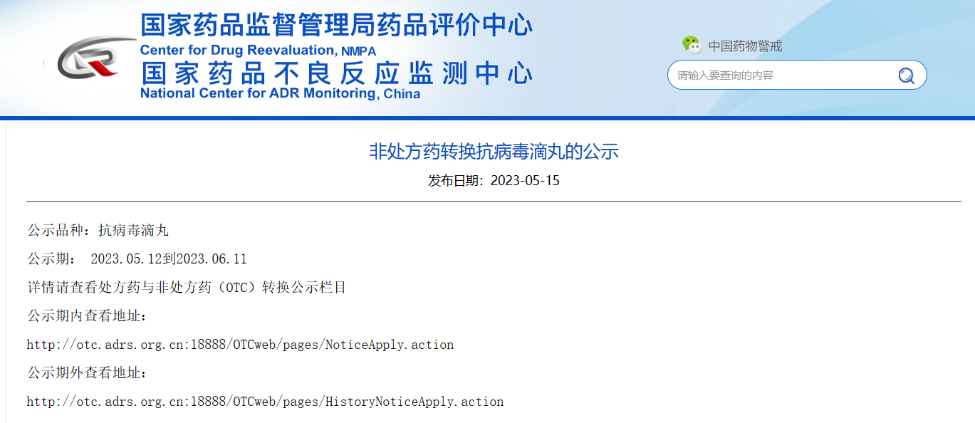 國家藥品不良反應(yīng)監(jiān)測中心發(fā)布非處方藥轉(zhuǎn)換抗病毒滴丸的公示