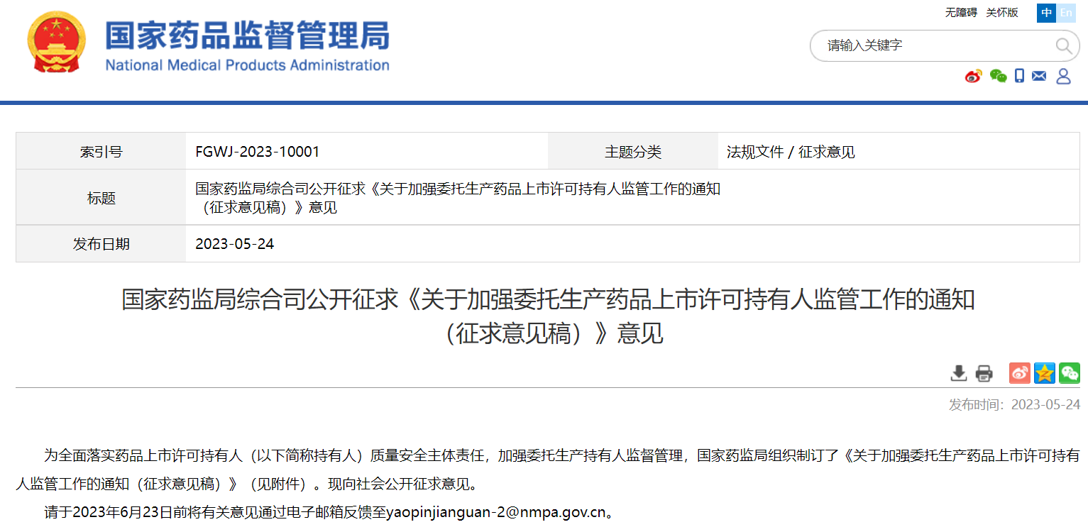 國家藥監(jiān)局綜合司公開征求《關(guān)于加強委托生產(chǎn)藥品上市許可持有人監(jiān)管工作的通知(征求意見稿)》意見
