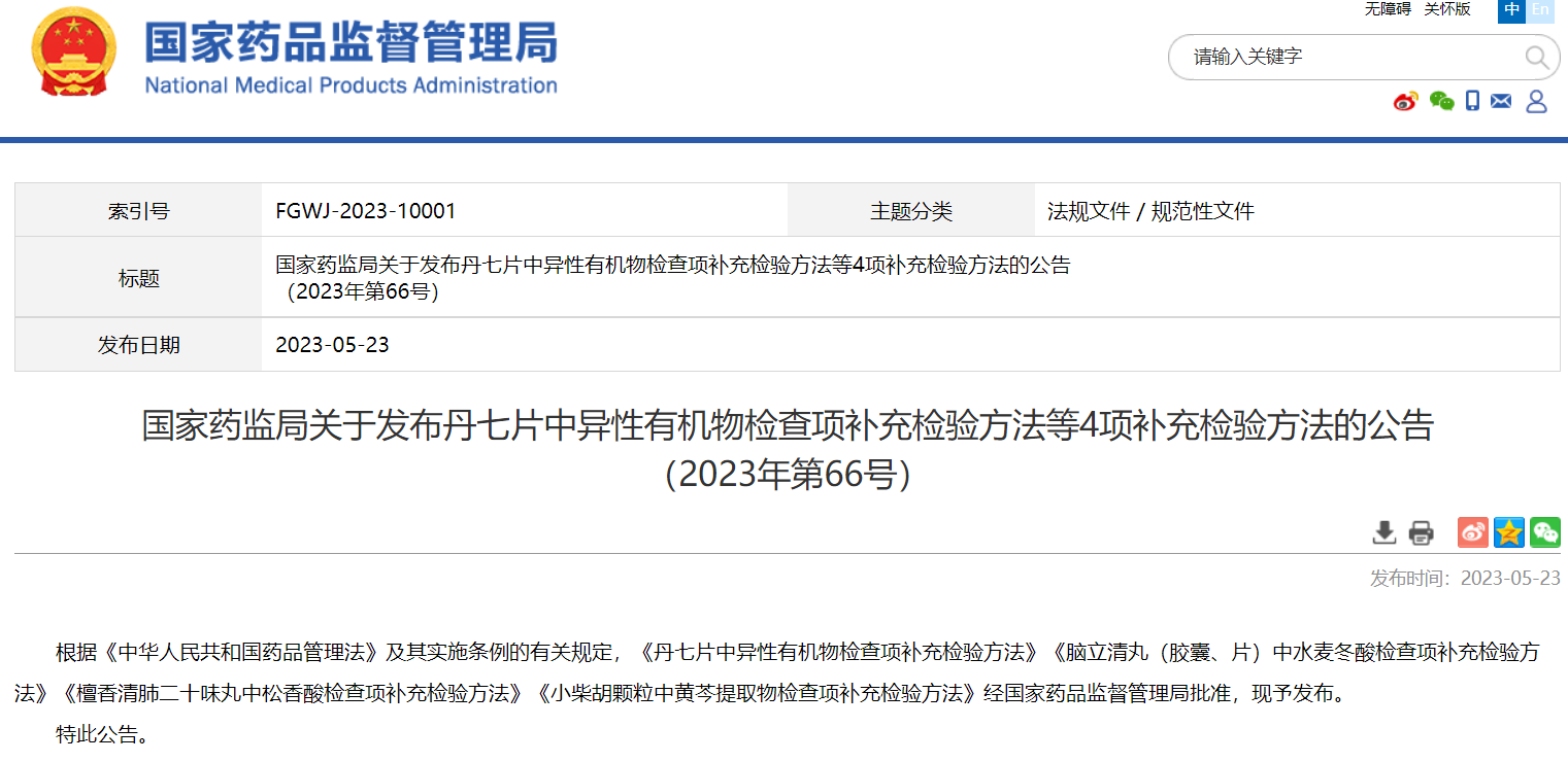 國家藥監(jiān)局關(guān)于發(fā)布丹七片中異性有機物檢查項補充檢驗方法等4項補充檢驗方法的公告(2023年第66號)